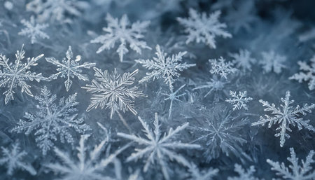 Illustrations of winter snowflakes featuring intricate and shimmering patterns in frosty blues, capturing the beauty and purity of snowflakes in seamless designs perfect for winter-themed backgrounds and decorations.