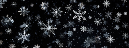 Panoramic banner of snowflakes isolated on a black background for edit photo.