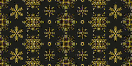 Seamless pattern with gold snowflakes on black for decoration of Christmas and New Year projects. Winter background for textiles, festive packaging, wallpaper.