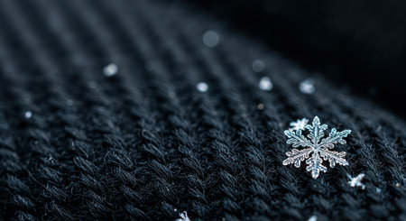 A mesmerizing macro view showcases a perfectly formed ice crystal with six arms, contrasting sharply against the deep blue-black threads of a woolen garment.