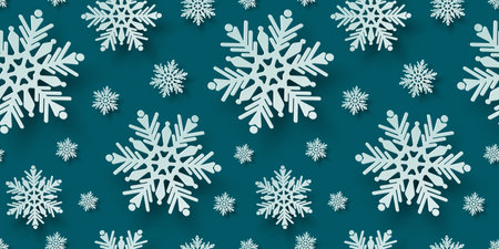 Seamless pattern with paper cut snowflakes. Christmas design 3D illustration on teal colored background for presentation, banner, cover, web, flyer, card, sale and social media.
