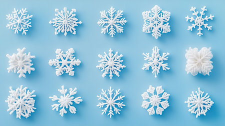 Discover a collection of unique snowflakes showcasing intricate designs against a soft blue background, perfect for winter-themed projects or seasonal designs.