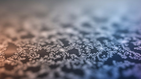 Macro view of intricate frost patterns resembling snowflakes on a dark surface with a color gradient.
