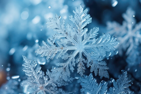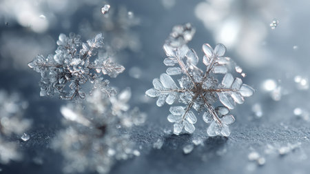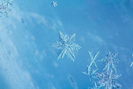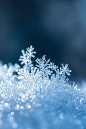 A captivating close-up image of delicate snowflakes on a frozen surface, showcasing intricate patterns against a serene blue backdrop, perfect for winter themes.