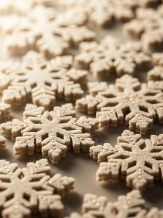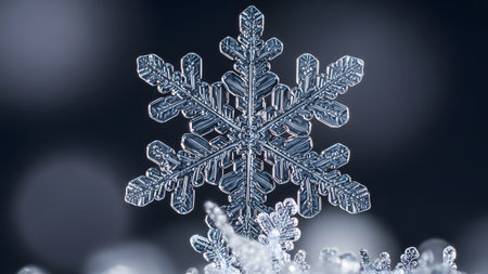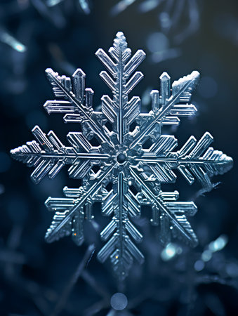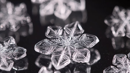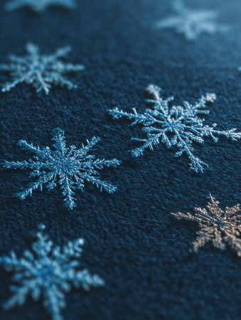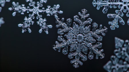 An enchanting closeup image of delicate, intricate snowflakes shimmering beautifully against a rich, dark background, evoking the pure essence of winter and the joyful spirit of the holiday season