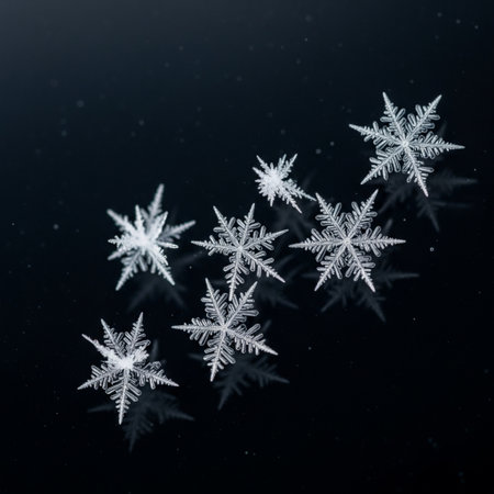 Intricate snowflakes drift softly through a chilly winter atmosphere.