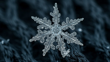 A detailed close-up of a single snowflake against a dark, blurred background, showcasing its intricate structure and crystalline beauty.