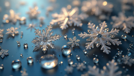 A stunning array of intricate snowflakes rests atop a shimmering blue background, interspersed with glistening droplets of water. This enchanting winter scene captures the beauty of natures artistry, evoking feelings of tranquility and wonder.