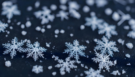 Delicate snowflakes rest on a dark surface, capturing the essence of winters beauty and tranquility on a snowy day