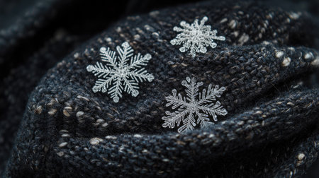 This closeup image features exquisite embroidered snowflakes on a sleek black fabric, showcasing intricate details and a stylish winter aesthetic.