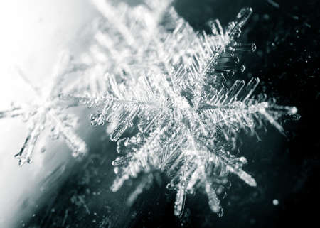 Snowflake, natural crystal on glass. Beautiful geometric natural pattern. Winter, frosty or New Year's concert.