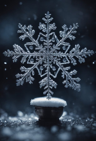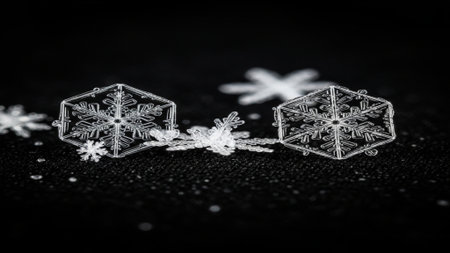 An enchanting closeup image of delicate, intricate snowflakes shimmering beautifully against a rich, dark background, evoking the pure essence of winter and the joyful spirit of the holiday season
