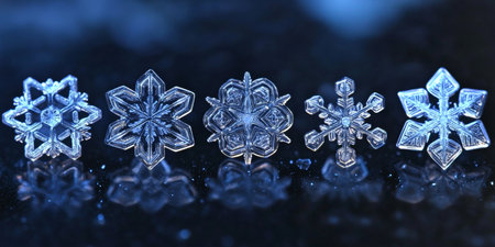 Snowflakes shimmer against a dark background, creating striking contrast that highlights their intricate designs. The arrangement of the crystals evokes a sense of winter tranquility, showcasing nature's artistry during the cold season. Generative AI