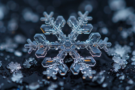 An extreme macro photograph of a single, perfectly formed ice crystal snowflake resting on a wet, reflective surface. The delicate details of the snowflake are highlighted against a soft, out-of-focus background with bokeh, symbolizing winter's unique beauty.