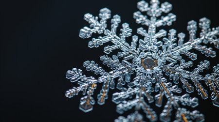 This stunning close-up captures an intricate snowflake against a dark backdrop, showcasing its delicate structure and unique patterns. Perfect for illustrating winter themes.