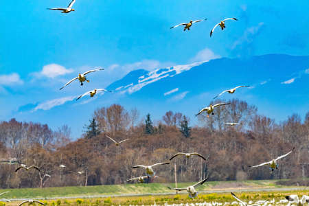 Many Snow Geese Flying Flock Snowy Mount Baker Mountains Skagit Valley Washington