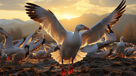 Flock of birds flying over a frozen lake and mountains in the background