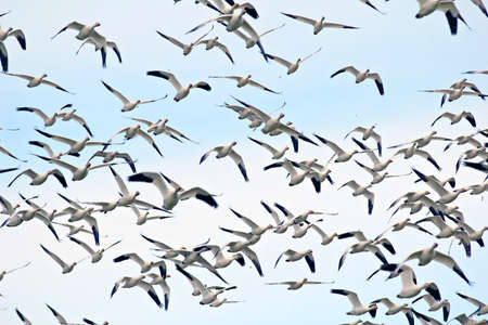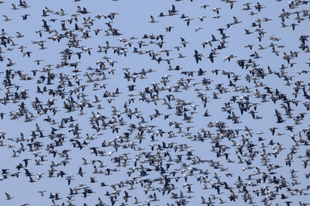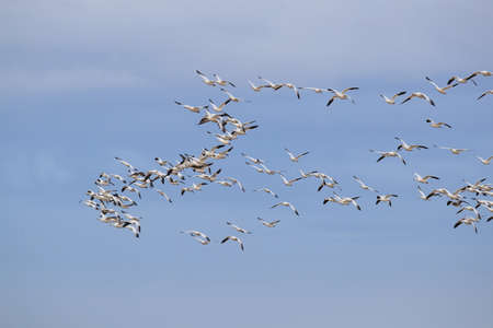 Hundreds of Snow Goose (Anser caerulescens) flocking together filling the blue sky