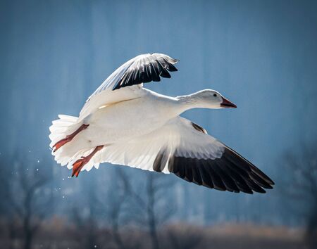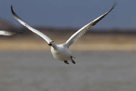 Carefully focused Snow Goose, wings open, comes in for a smooth landing at Bernardo Wildlife Area, a waterfowl management site, n New Mexico, United States