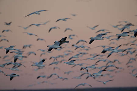 A flock of Snow Geese (Anser caerulescens) soaring over the marshes of Canada's Cap Tourmente National Wildlife Area, their white bodies and black-tipped wings a majestic sight against the twilight sky.