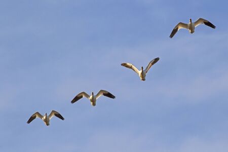 Four snow geese flying with light clouds on a blue sky.
