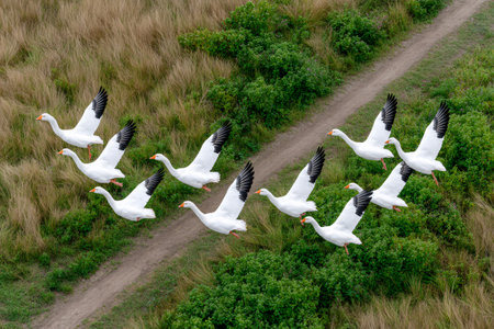 Aerial view of snow geese flying in v-shaped formation over green vegetation and a dirt road, concept of wildlife and migration