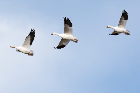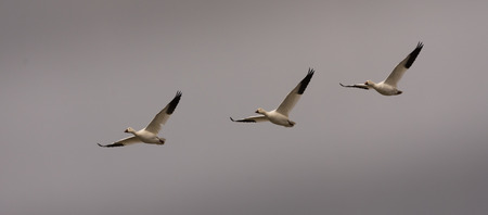 Snow geeses trio flying toward the Arctic