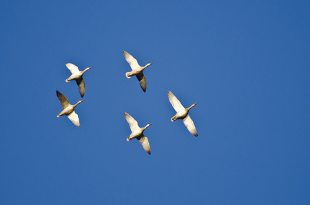 Five Mallard Ducks Flying in a Blue Sky