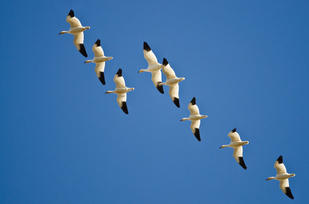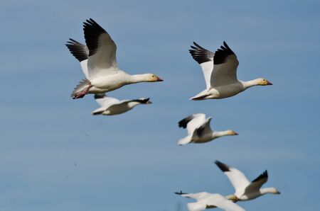 Small Flock of Snow Geese Flying in a Blue Sky