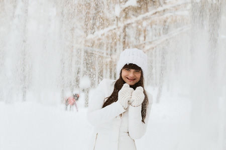 Winter portrait of a beautiful woman in the snowfall