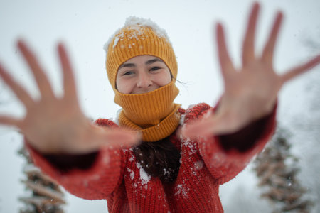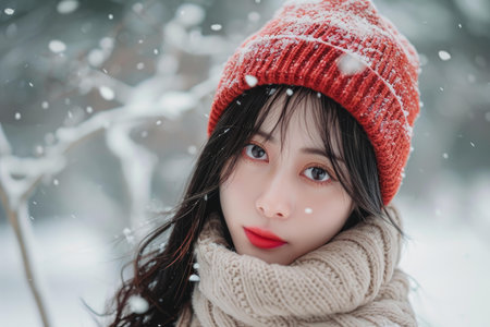 Close-up portrait of a woman wearing a red knitted hat and scarf, with delicate snowflakes scattered across her face and accessories. the image exudes a serene winter atmosphere, perfect for seasonal and holiday-themed designs, cards, and posters. Generative AI