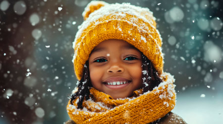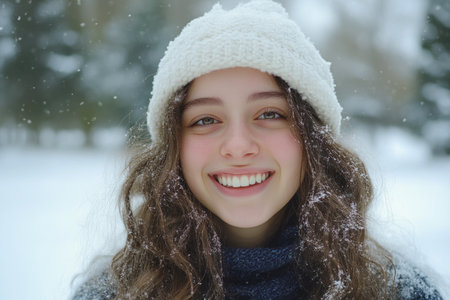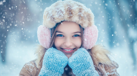 A joyful girl, dressed warmly in a hat and earmuffs, flashes a big smile as snowflakes gently fall around her, embodying the spirit of winter and happiness.