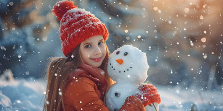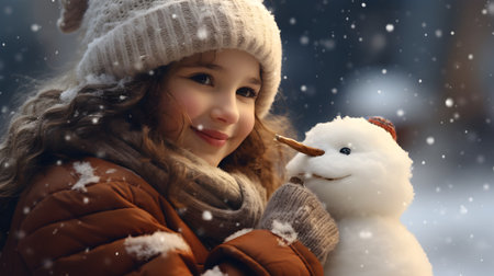 Girl playing with a snowman outdoor background, Winter Season - Ai Generated