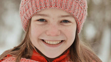 A woman with a warm knitted hat pulled over her eyes smiles and enjoys the snow, cold weather. Outdoor activities, season, winter, snow melts. Covered with frost, beautiful smile. Close-up portrait