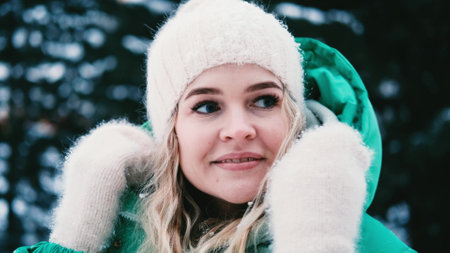 Close-up of woman in cozy winter hat smiling in snow