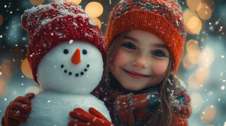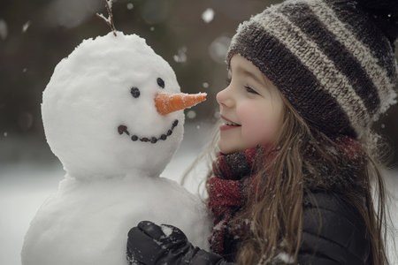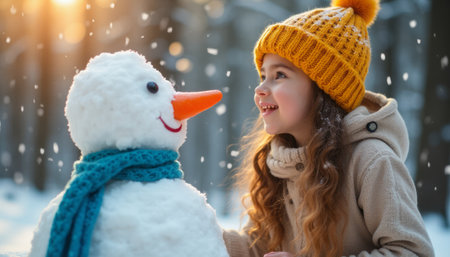 A cheerful young girl with curly hair beams at a friendly snowman, adorned with a bright orange carrot nose and a cozy blue scarf. The enchanting winter scene is filled with softly falling snowflakes, creating a magical atmosphere that captures the pure joy of childhood and the beauty of snowy days.