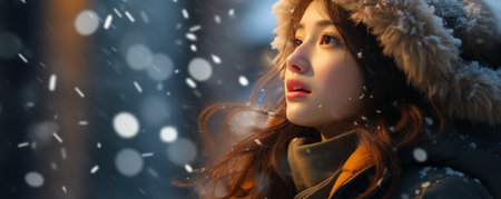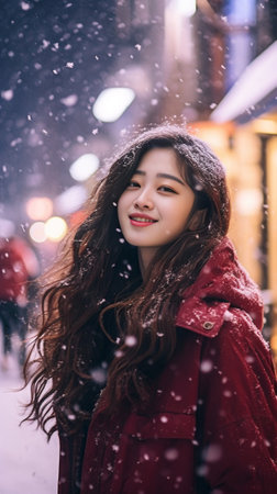 Young Asian woman in a warm scarf and coat surrounded by falling snowflakes, creating a peaceful winter scene perfect for seasonal themes, lifestyle promotions, or festive content
