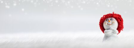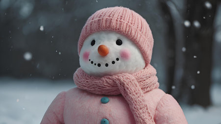 Funny snowman in pink knitted hat and scarf on snowy background
