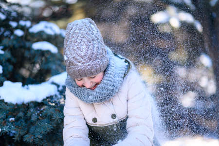 Close portrait of a girl teenager wearing red jacket and hat and blowing the snow out of her hands at the winter park. Young woman having fun on a bright winter day in the forest. Happiness concept.