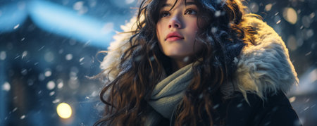 A close-up portrait of a young woman in a snowy, winter landscape adorned with sparkling lights. The scene evokes warmth and holiday spirit, highlighting beauty in a serene moment.