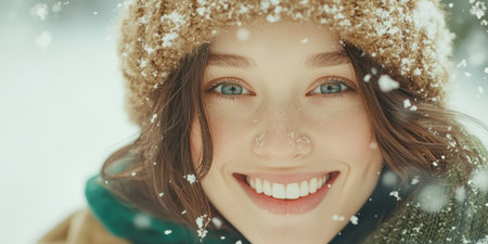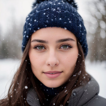 Close-up of a young woman in a beanie, surrounded by a serene snowfall