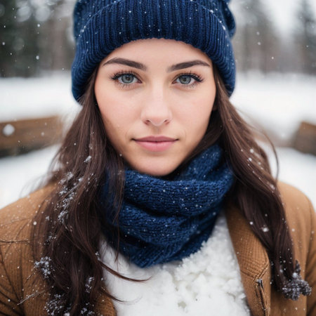 An AI generated illustration of a youthful woman wearing a navy blue wool hat in winter