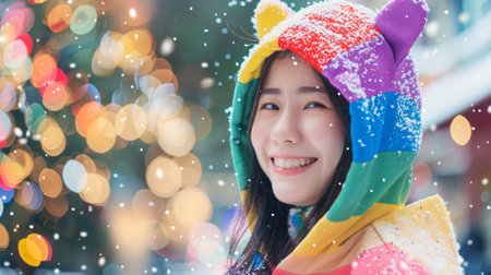Asian woman with a rainbow hat smiling in the snow. Concept of winter joy, colorful fashion, urban happiness, and snowy day.
