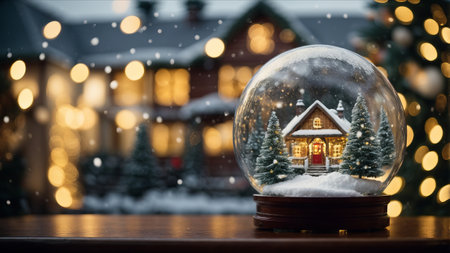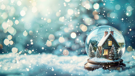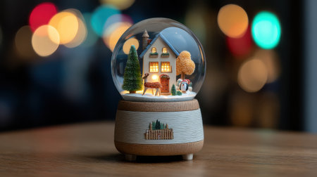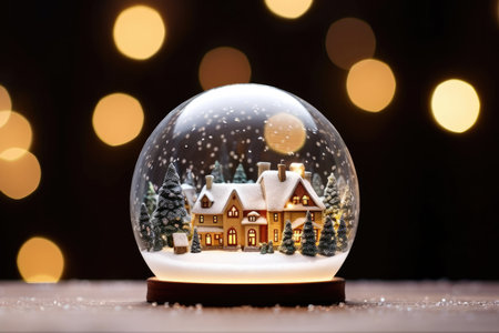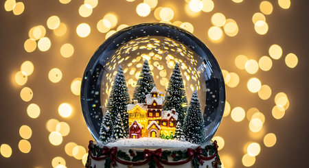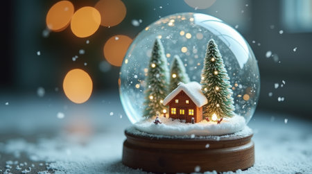 A detailed snow globe featuring a miniature house, trees, and festive lights, set against a bokeh background.