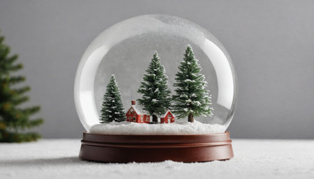 An AI generated illustration of An isolated snow globe filled with a miniature Christmas tree, resting atop a white snow-covered landscape