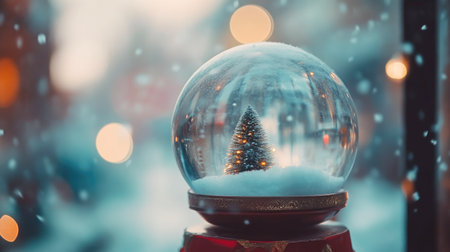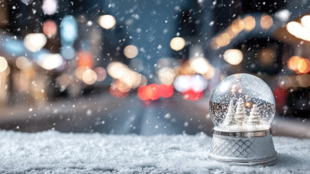 Snow globe sits snowy surface, capturing miniature winter scene inside. Soft snowflakes fall gently around it, creating magical winter atmosphere. blurred lights of city street add to enchanting