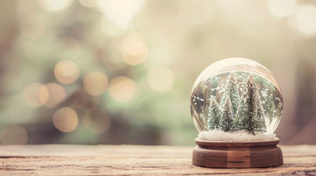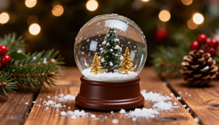 Snow globe with miniature Christmas trees sits on a rustic wooden table with scattered faux snow and blurred warm bokeh lights in the background with empty space for text and a cozy festive atmosphere