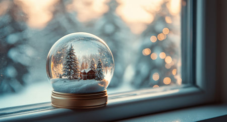Snow globe with house on the windowsill. Christmas and New Year concept