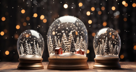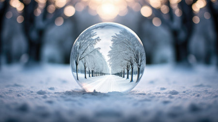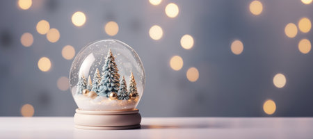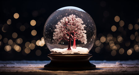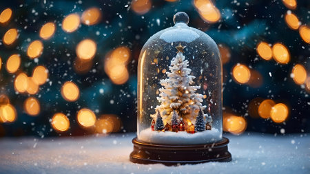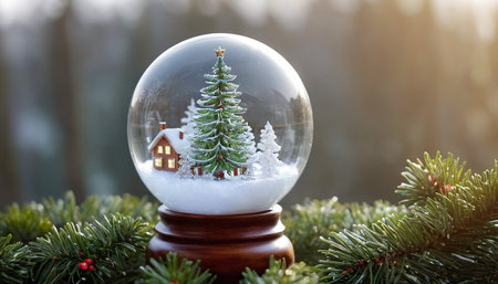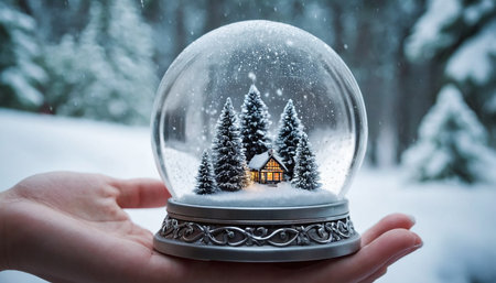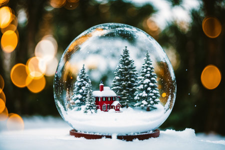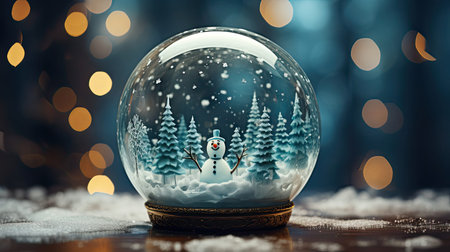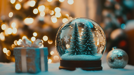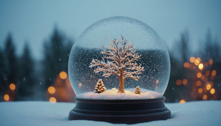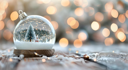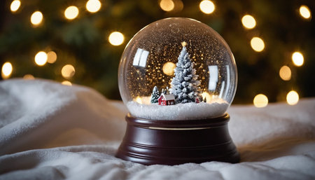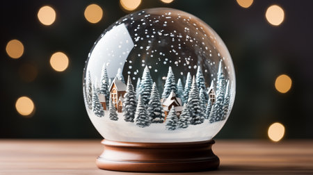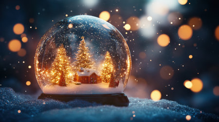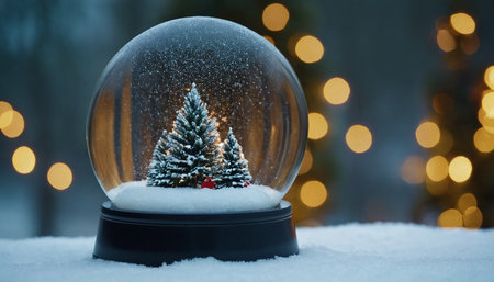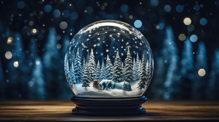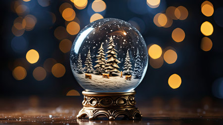 A captivating snow globe featuring a serene forest scene, complemented by warm lights and soft bokeh, evoking the magic of winter celebrations and holiday spirit.