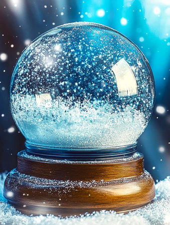 A close-up of a magical snow globe, showcasing a detailed winter wonderland inside with snow falling gently.